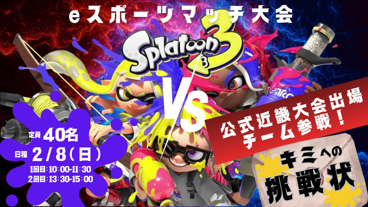 ①任天堂Switchがある ②Switch付属品「Doc(ドック)」の準備ができる③スプラトゥーン3のソフトを持っている ④任天堂オンラインサービス加入している(オンライン対戦に必要) ※お持ちでない場合、ご参加が難しい場合があります。 |